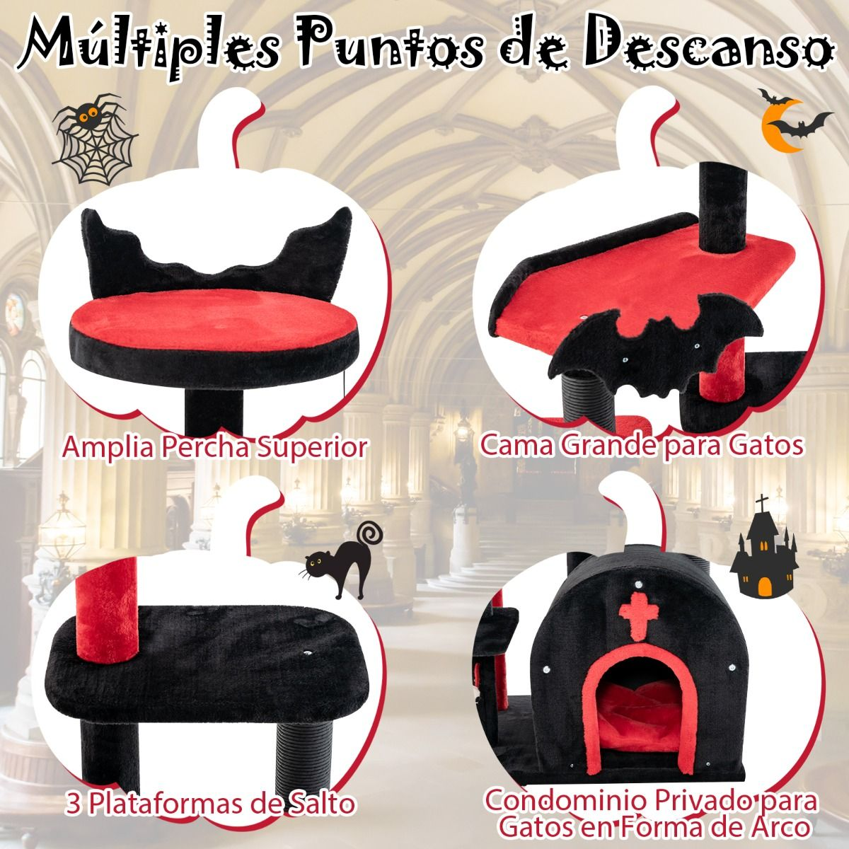 Estilo Gótico Impactante: Este único árbol para gatos gótico presenta un diseño de arco de iglesia, decoraciones de murciélago y una forma de cama única, que abarca la elegancia oscura. El esquema de colores negro y rojo crea un aspecto visualmente impresionante. Es una adición perfecta a tus decoraciones de Halloween.