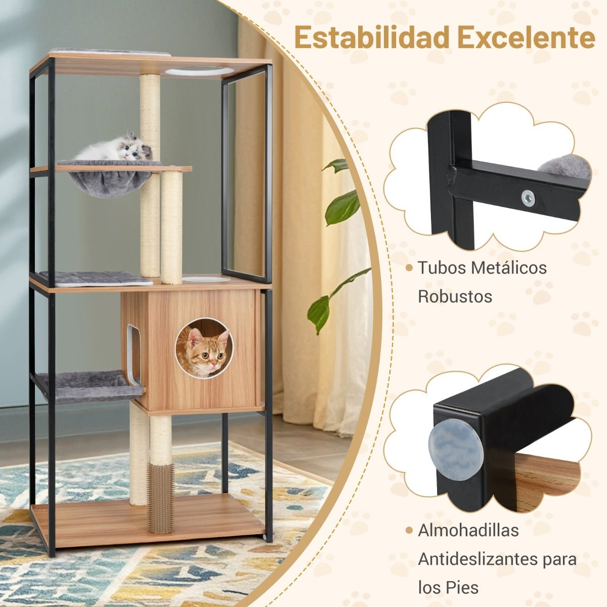 La torre alta para gatos está soportada por tubos metálicos con recubrimiento en polvo, asegurando que permanezca estable.