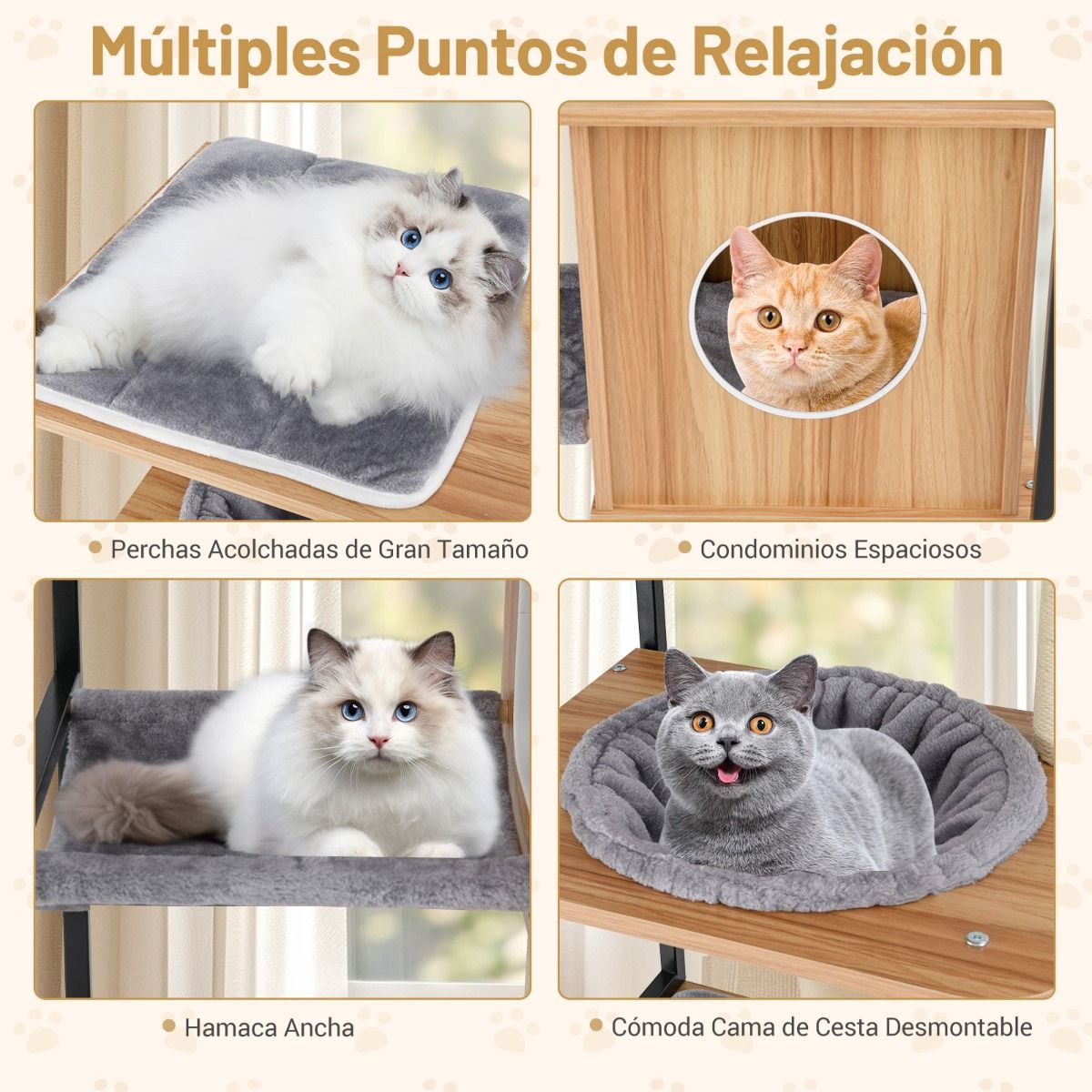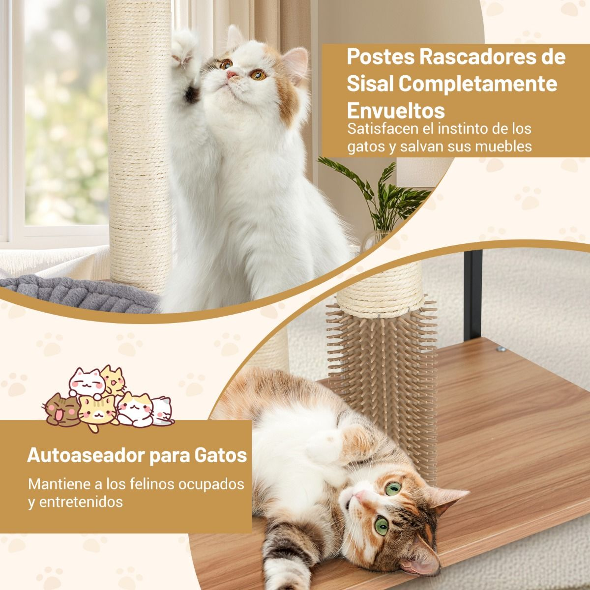Rascadores de Sisal Natural: Múltiples postes rascadores cubiertos de sisal están diseñados para atraer a su gato a rascar y proteger sus muebles de posibles daños, satisfaciendo el instinto natural de los gatos.