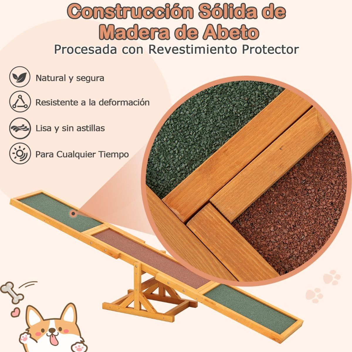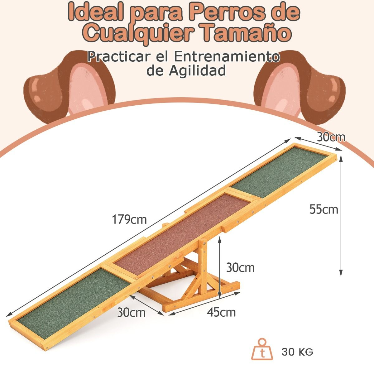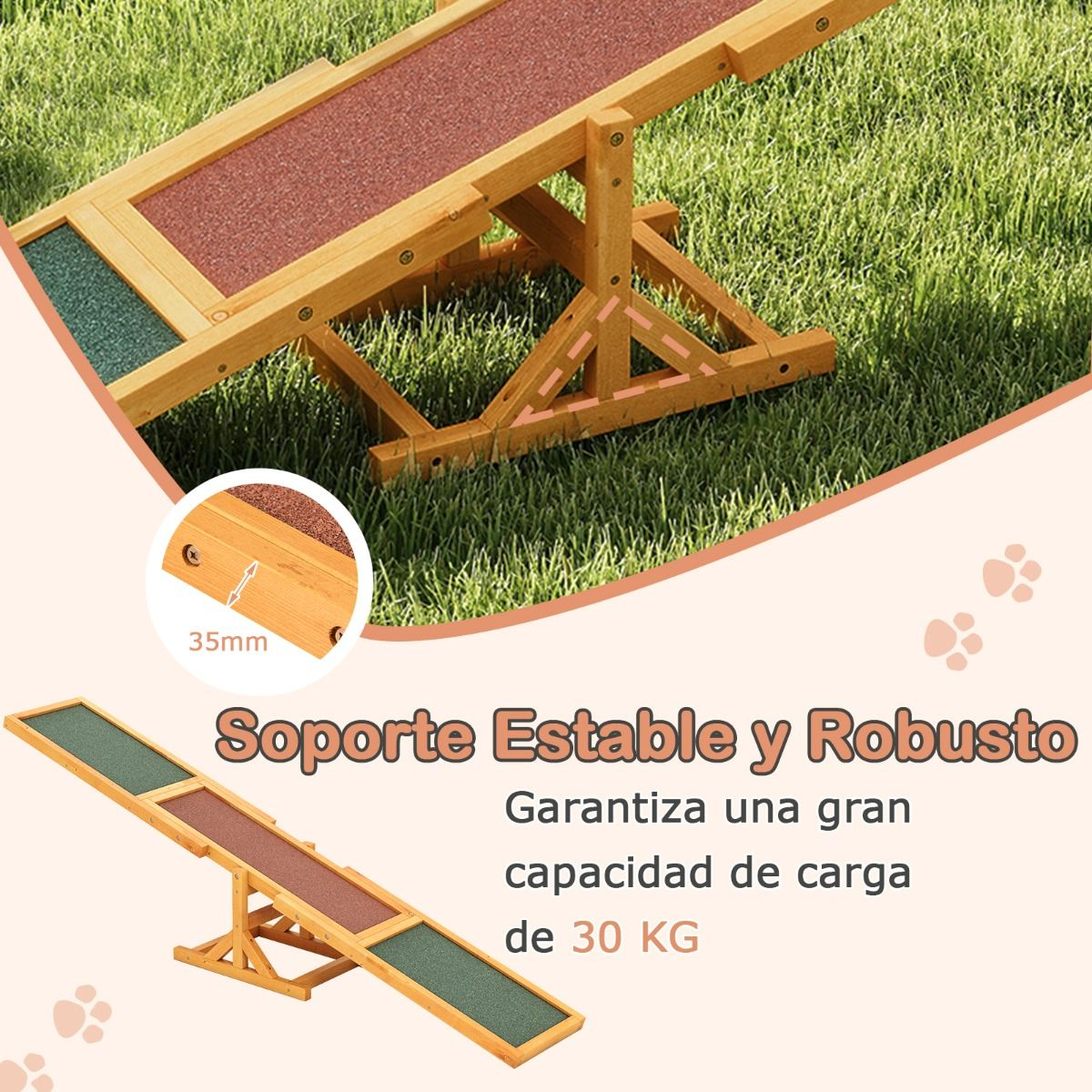 Nuestro balancín de agilidad para perros, fabricado con madera de abeto sólido, garantiza una estructura robusta y duradera, con una gran capacidad de carga (hasta 30 kg) y una base triangular que aumenta la estabilidad.