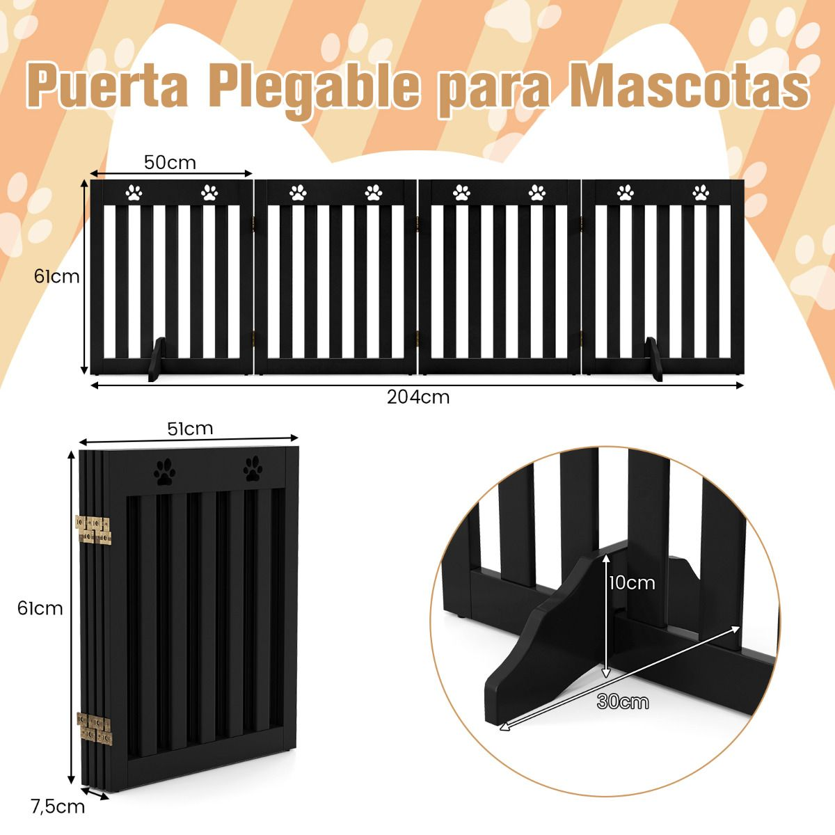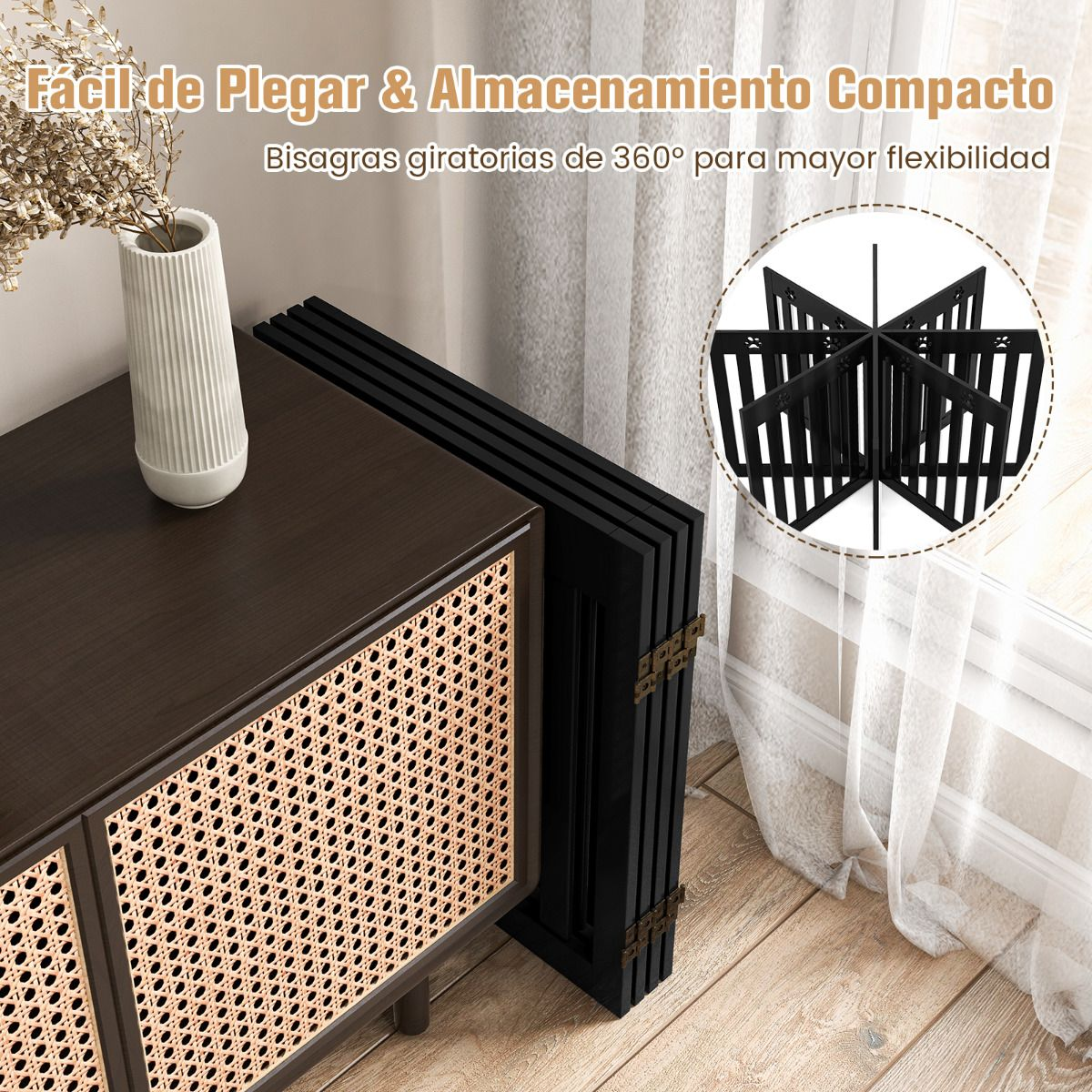 Diseño Plegable y Extensible: Con las bisagras de metal giratorias a 360°, esta verja de madera se puede plegar en forma de Z/U o expandir (tamaño abierto: 204 x 61 x 1,5 cm), siendo ideal para colocar en cocina, escaleras, entrada y otros lugares. Es fácil de desplazar y almacenar.