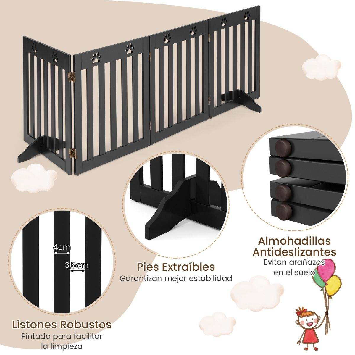 Estructura Resistente y Estable: Hecho en MDF de alta calidad y con pintura NT, esta verja de madera dura mucho tiempo y es impermeable. Las almohadillas en la parte inferior (pies antideslizantes) garantizan la estabilidad y protegen el suelo de los rasguños.