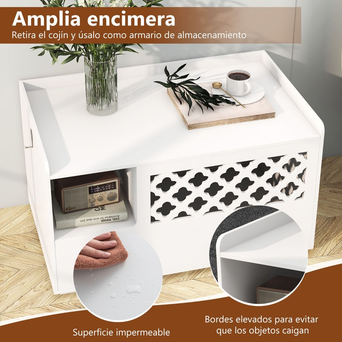 Amplia superficie con bordes elevados para evitar que se caigan los objetos