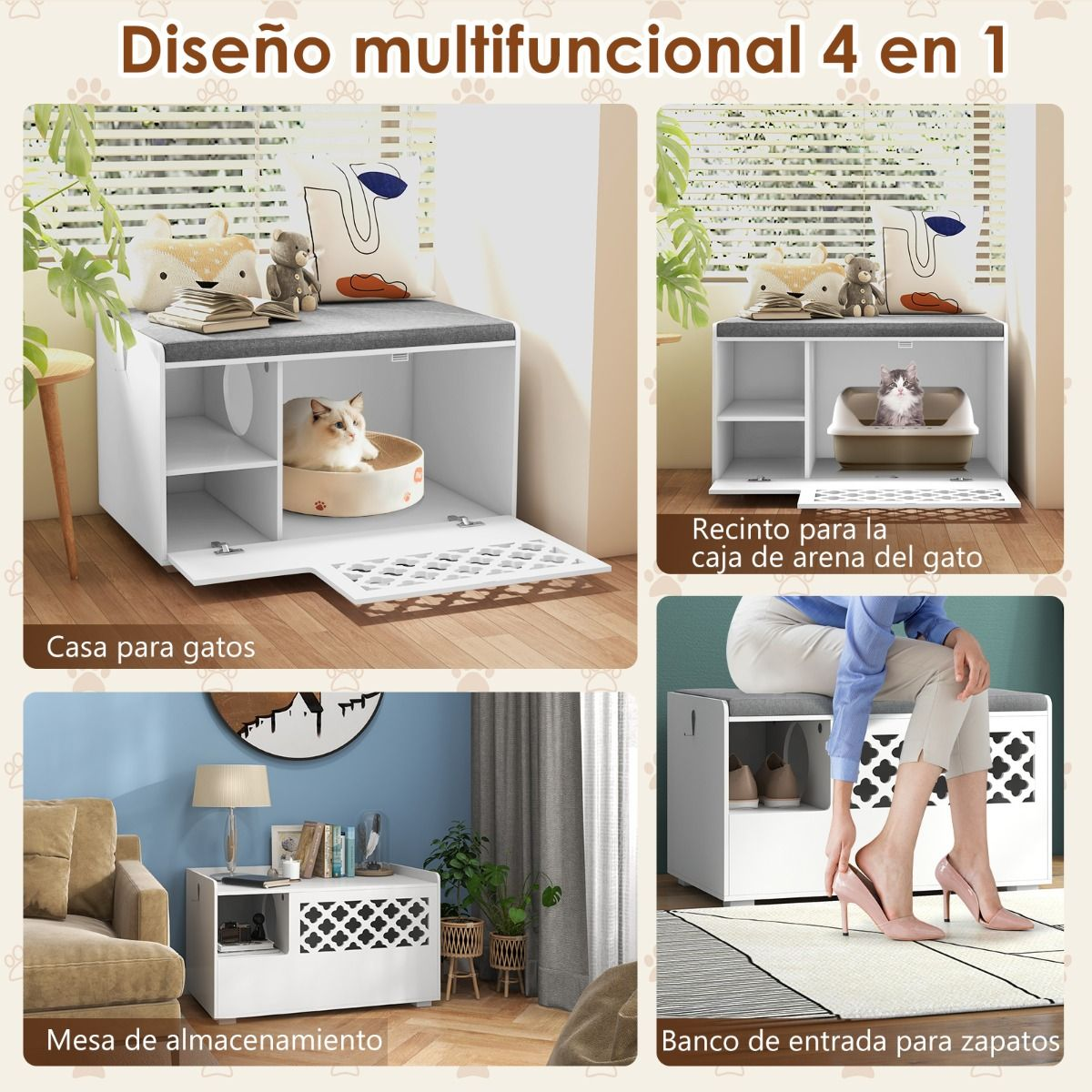 Diseño Multifuncional 4 en 1: Este banco para la caja de arena del gato puede funcionar como una casa para gatos o un recinto para la caja de arena para proporcionar privacidad y facilitar la limpieza de los gatos. También puedes usarlo como un banco de almacenamiento, banco de entrada, etc. Es la solución perfecta para espacios pequeños, combinando funcionalidad y estilo.