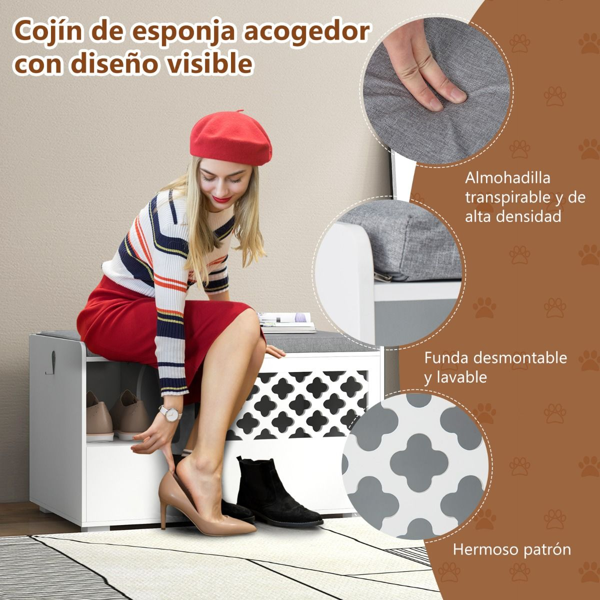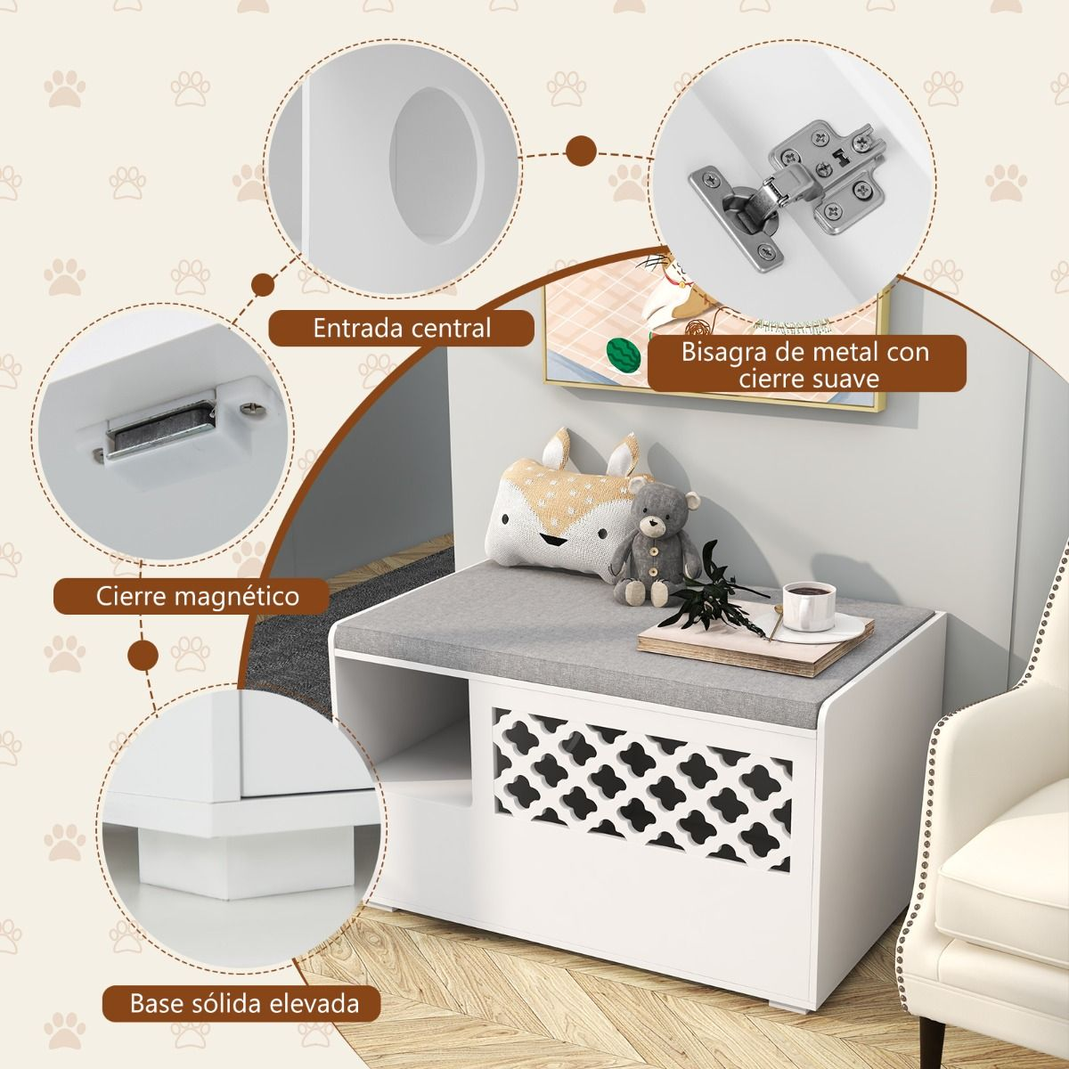 ¿Quieres mantener la casa limpia y ofrecer privacidad para los gatos? No busque más que nuestro práctico banco que ayuda a ocultar la caja de arena de los gatos. Este producto es adecuado para gatos de diferentes tamaños. Este banco para gatos de diseño 4 en 1 puede usarse como casa para gatos, recinto para la caja de arena para gatos y banco de entrada, también puedes quitar el cojín y usarlo como un mueble de almacenamiento. El cojín de esponja acogedor con una cubierta transpirable proporciona comodidad adicional, mientras que el diseño de la puerta visible y el patrón ahuecado estimulan la curiosidad del gato y brindan entretenimiento. El cojín con funda desmontable y lavable también es fácil de limpiar. Con características como una entrada interior para gatos y un práctico gancho lateral para colgar accesorios, este recinto para cajas de arena para gatos está bien hecho y diseñado para una funcionalidad óptima.