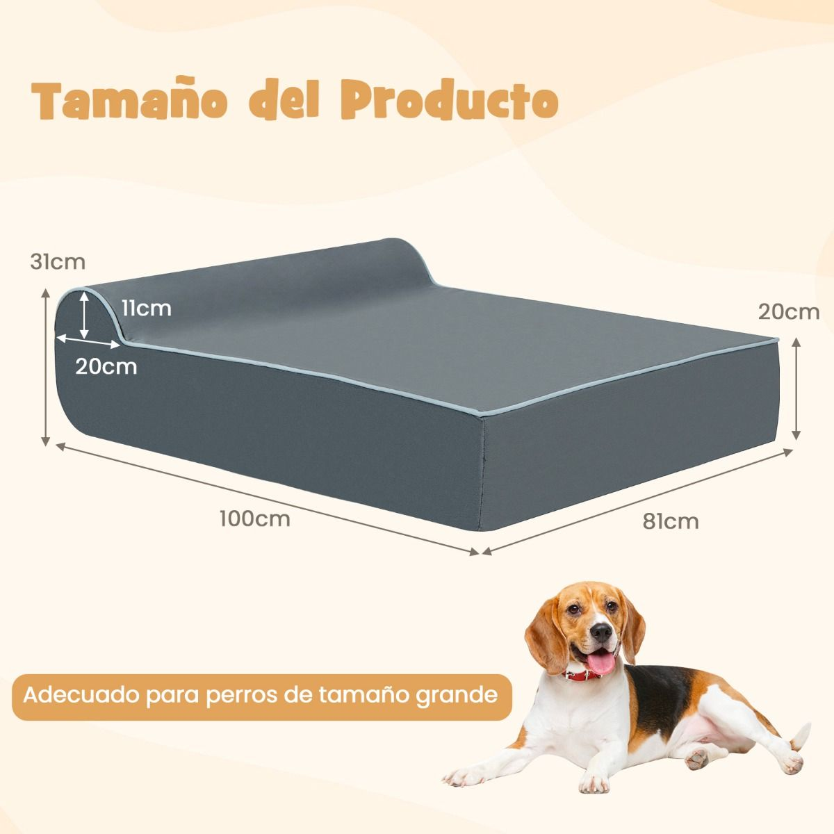 Amplio Espacio para Descansar: La zona de descanso de esta cama para perros talla grande mide 80 x 81 x 20 cm, ofreciendo un espacio amplio donde pueden estirar el cuerpo y disfrutar del relax y el sueño. Las dimensiones totales son 100 x 81 x 31 cm.