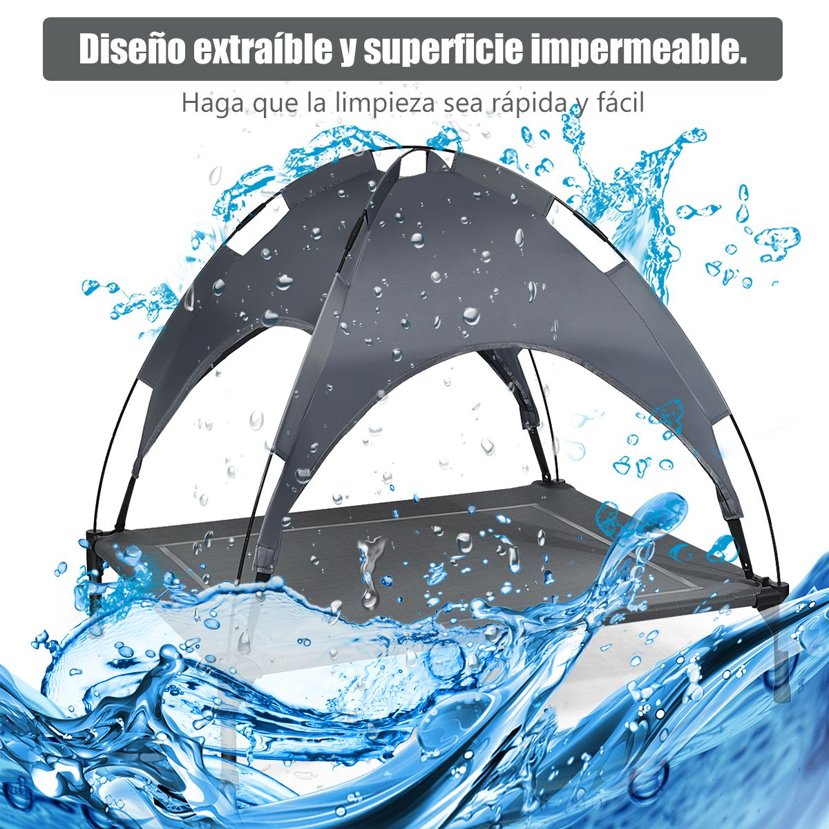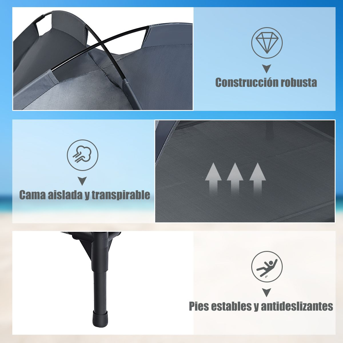Portabilidad y Limpieza: Es ligera y se transporta fácilmente, ideal para camping, césped y playa. La superficie impermeable se puede desmontar y se limpia fácilmente. El toldo se puede quitar para utilizarla como simple cama.