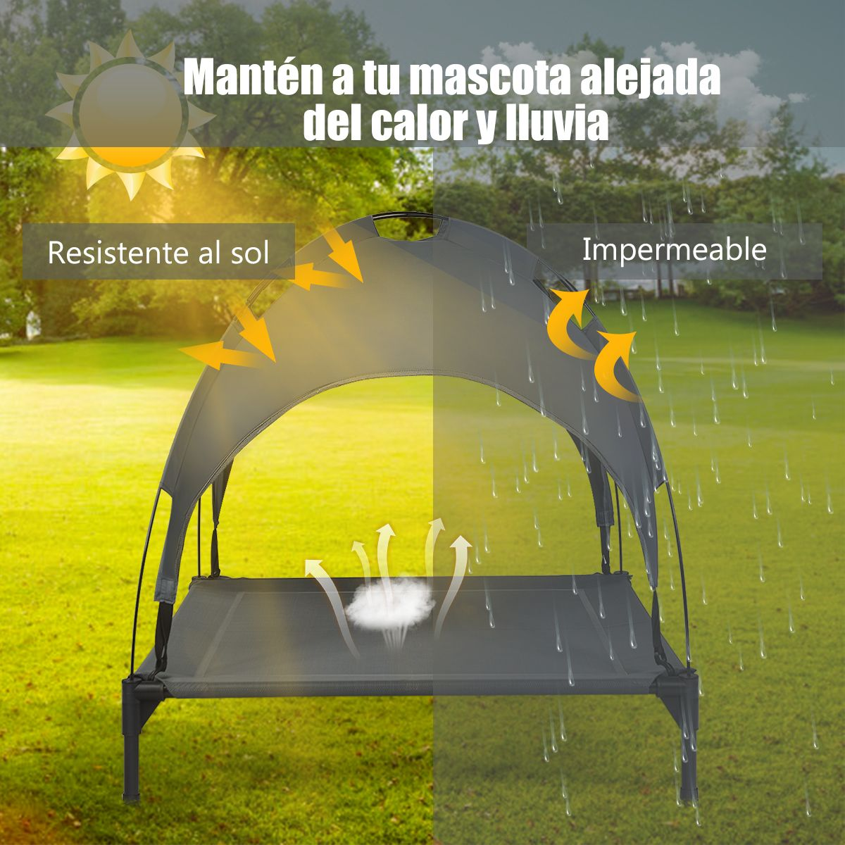Toldo Impermeable y Resistente al Sol: Con un toldo desmontable, mantiene la mascota a la sombra y fresca en verano. Además, bloquea los rayos solares y la lluvia y es ideal para uso externo.