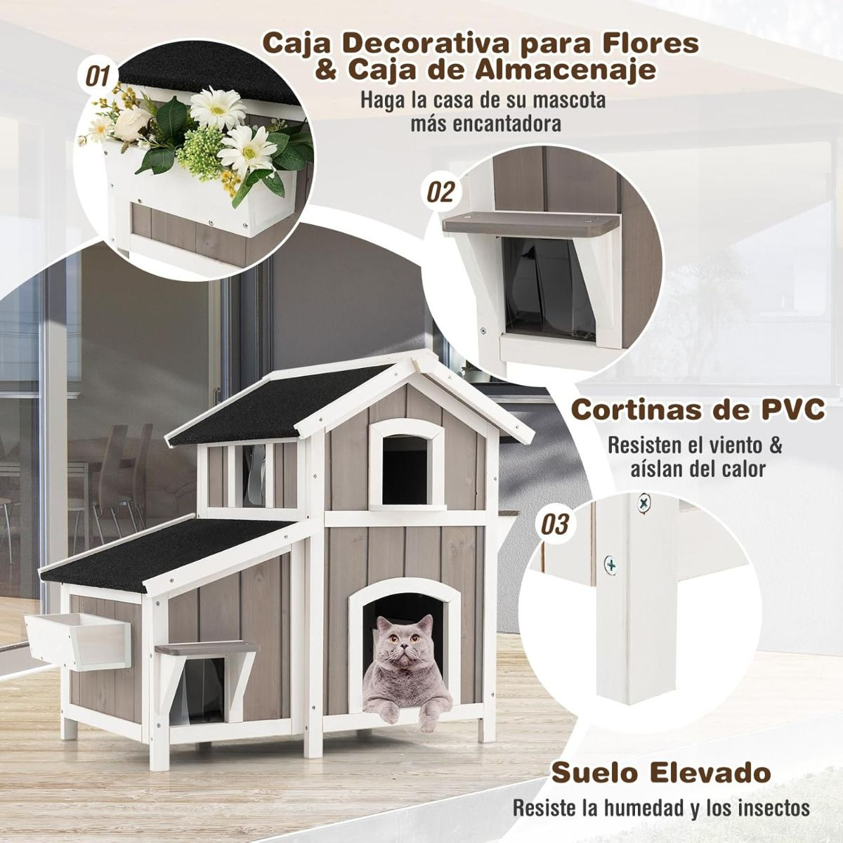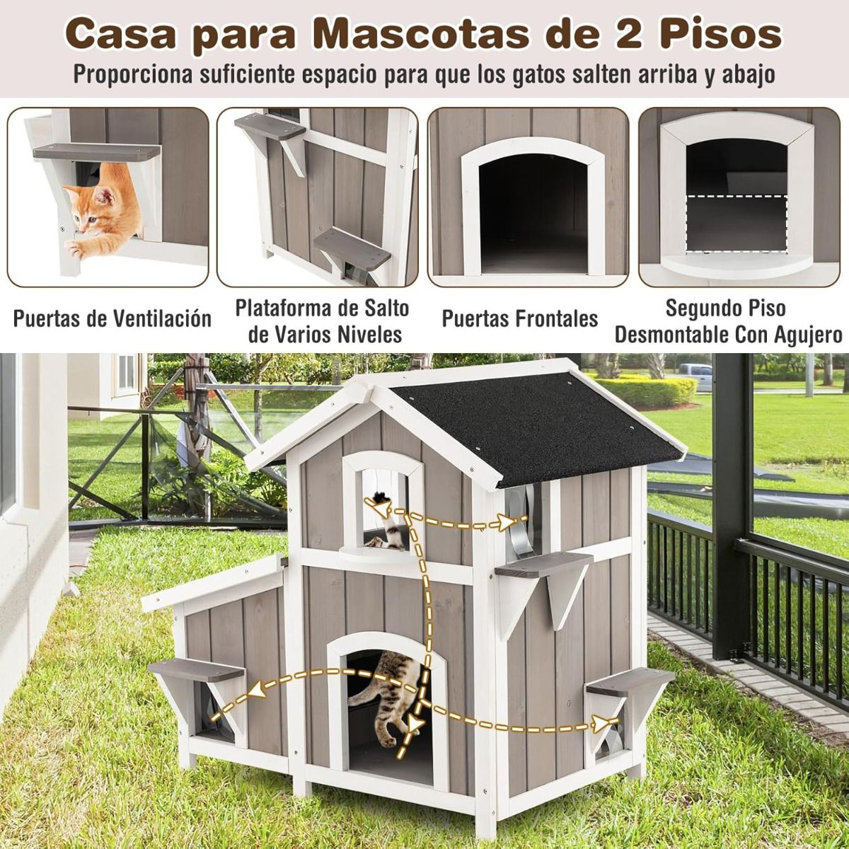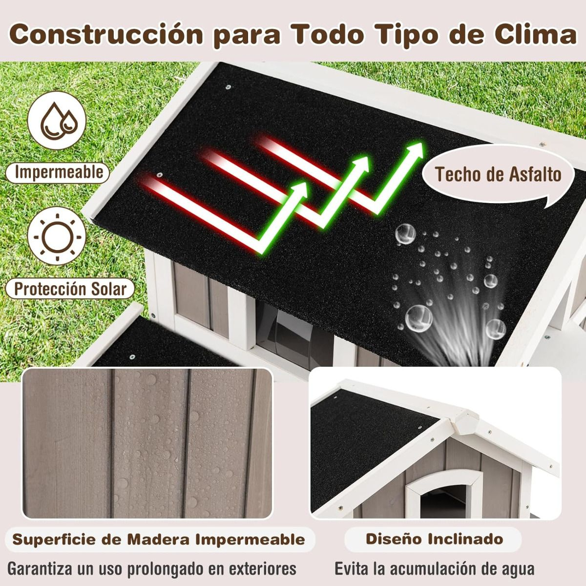 Acceso y Seguridad: Viene con 4 puertas de escape y 2 puertas frontales, evitando que sus mascotas queden atrapadas. Las cortinas de PVC en las puertas de escape ayudan a resistir el viento y mantener el interior cálido. Las plataformas de salto de varias capas sirven para que los gatos suban y jueguen.