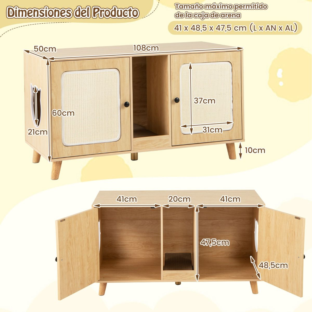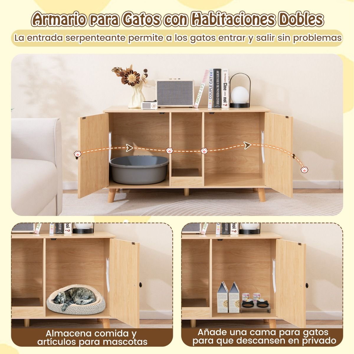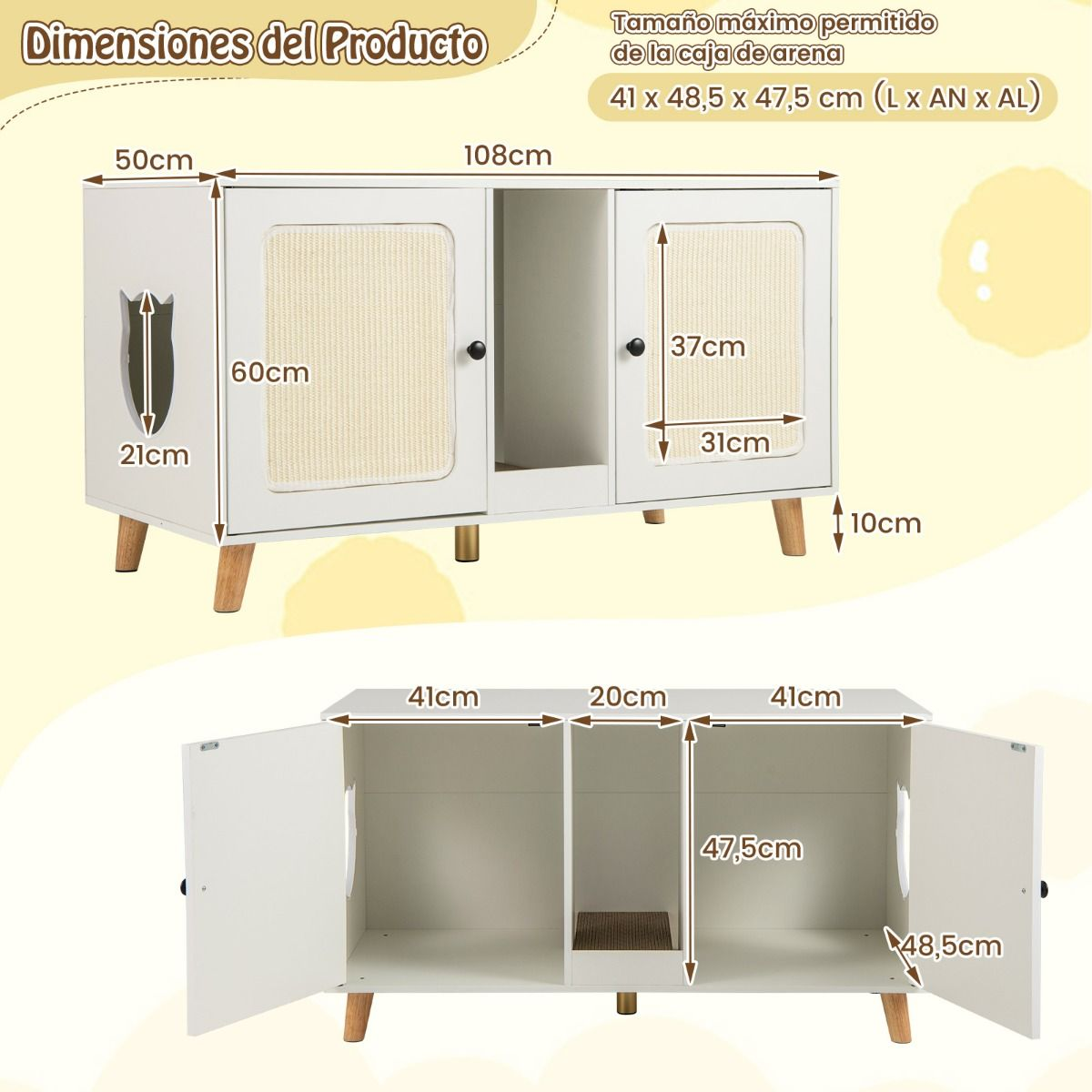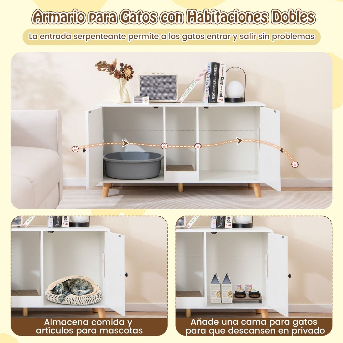 Este gabinete para gatos con dos habitaciones mide 108 x 50 x 60 cm (L x An x Al), ofreciendo espacios independientes y cómodos para 2 mascotas.