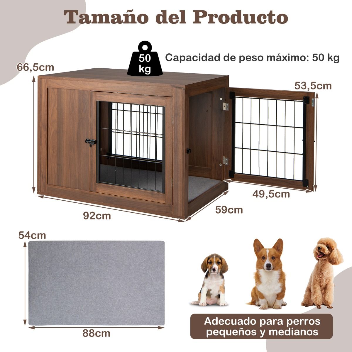 • Con medidas de 92 cm x 59 cm x 66,5 cm, la jaula mueble para perros es adecuada para la mayoría de perros pequeños y medianos.